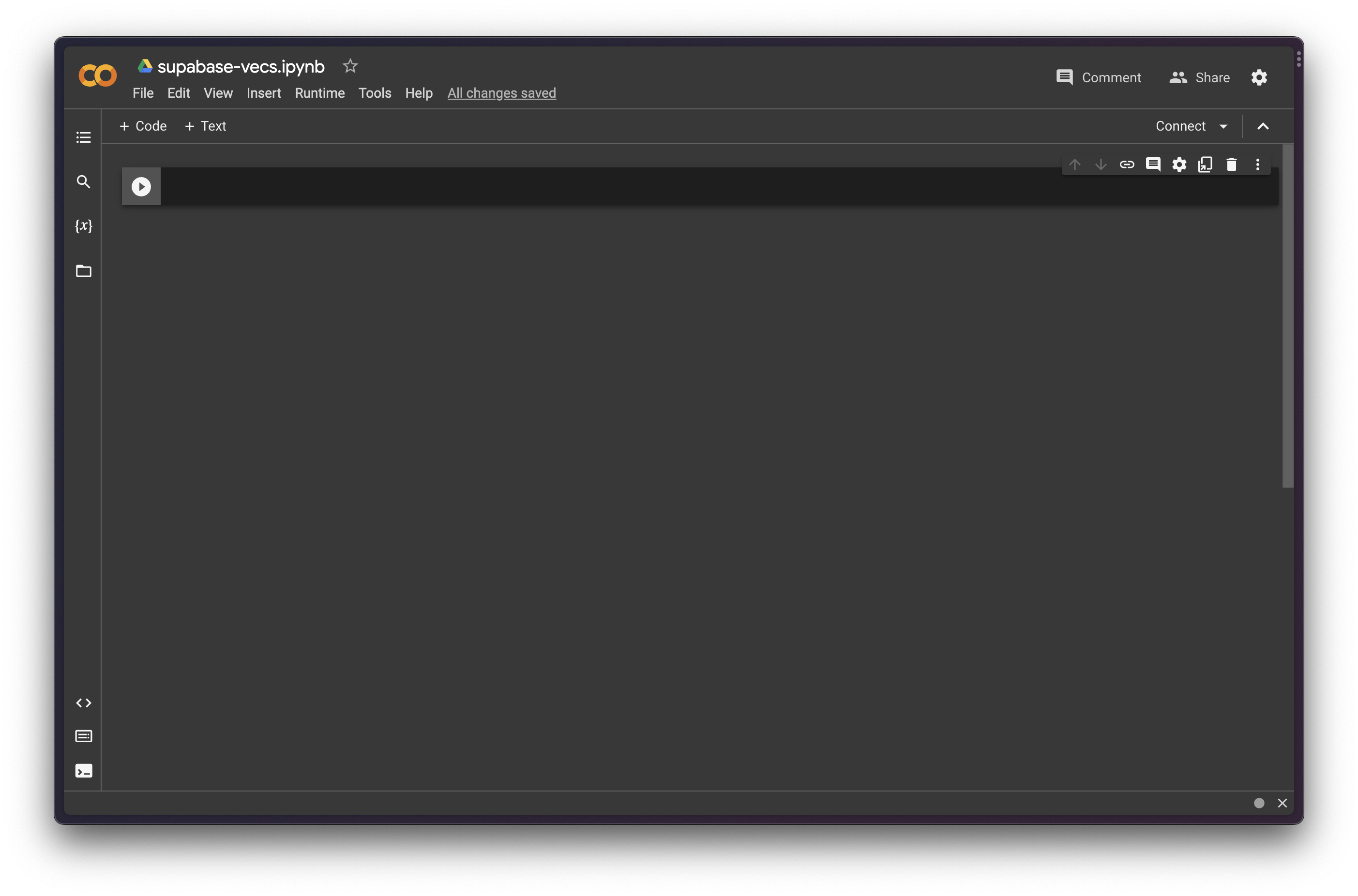 1import vecs23DB_CONNECTION = "postgres://postgres.xxxx:password@xxxx.pooler.supabase.com:6543/postgres"45# create vector store client6vx = vecs.create_client(DB_CONNECTION)Execute the code block (ctrl+enter). If no errors were returned then your connection was successful.
